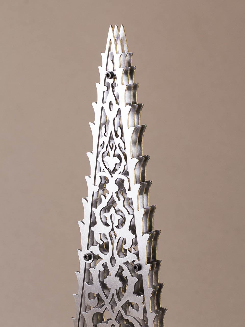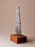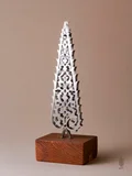 این محصول هنری یک مجسمه فلزی درخت سرو ایرانی است که با ظرافتی مثال زدنی از دل فلز بریده شده و روی پایه چوبی دستساز قرار گرفته است. ترکیب خطوط اسلیمی دوره قاجار، فرم کشیده و بافت طبیعی چوب، این قطعه را به یک انتخاب عالی برای دکوراسیون مینیمال، مدرن و حتی پست مدرن تبدیل میکند. طراحی منحصربه فرد این مجسمه باعث میشود به عنوان یک نقطه کانونی روی میز کار، کنسول ورودی یا قفسه دکوری به خوبی دیده شود