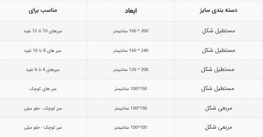 | مستطیل شکل | 200 * 135 سانتیمتر | میزهای 4 تا 6 نفره |