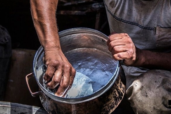 - تمیز کردن ظرف: ابتدا سطح داخلی ظرف مسی کاملاً تمیز و از چربی یا اکسید مس پاک میشود.