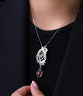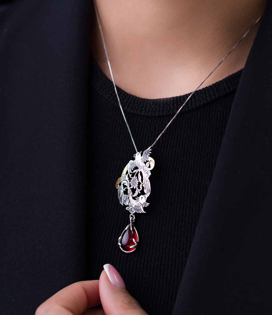 در قسمت پایین این آویز، سنگ لعل قرمز با تراش اشکی به کار رفته که با درخشش گرم و عمیق خود، انرژی عشق، آرامش و اعتمادبهنفس را به شما القا میکند. ترکیب رنگ نقره، طلایی و قرمز باعث شده این اثر هم برای استفاده روزمره و هم برای مجالس رسمی، انتخابی چشمگیر و خاص باشد.