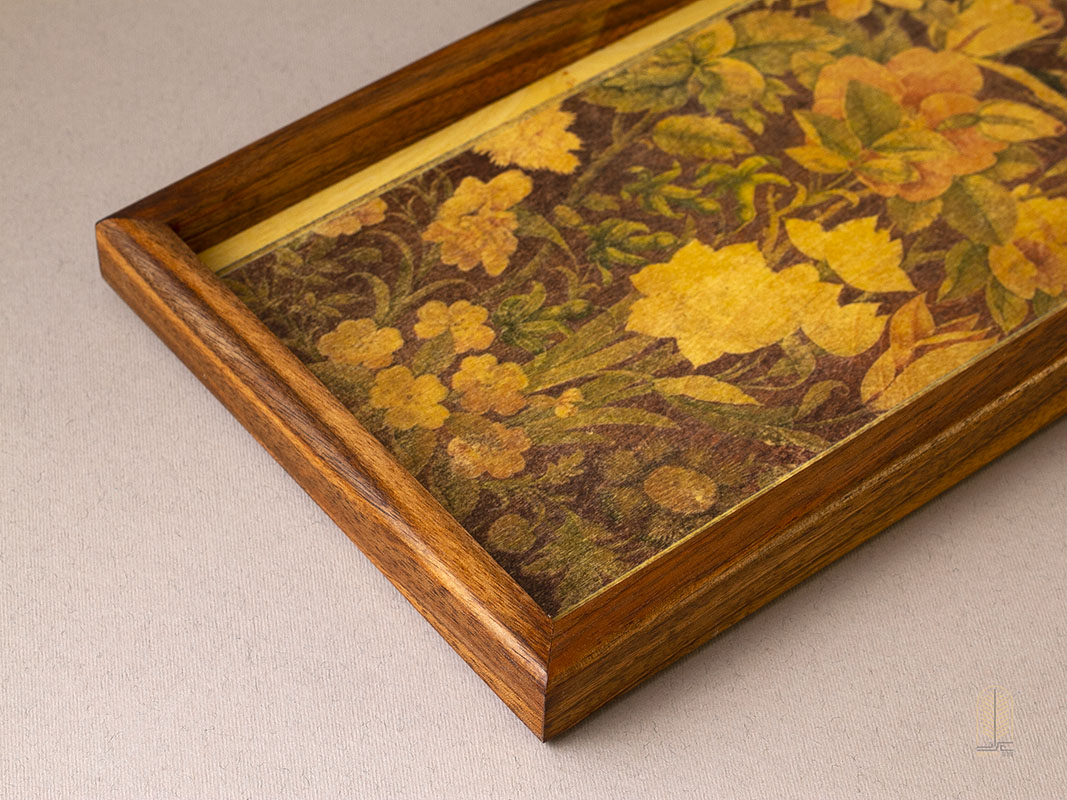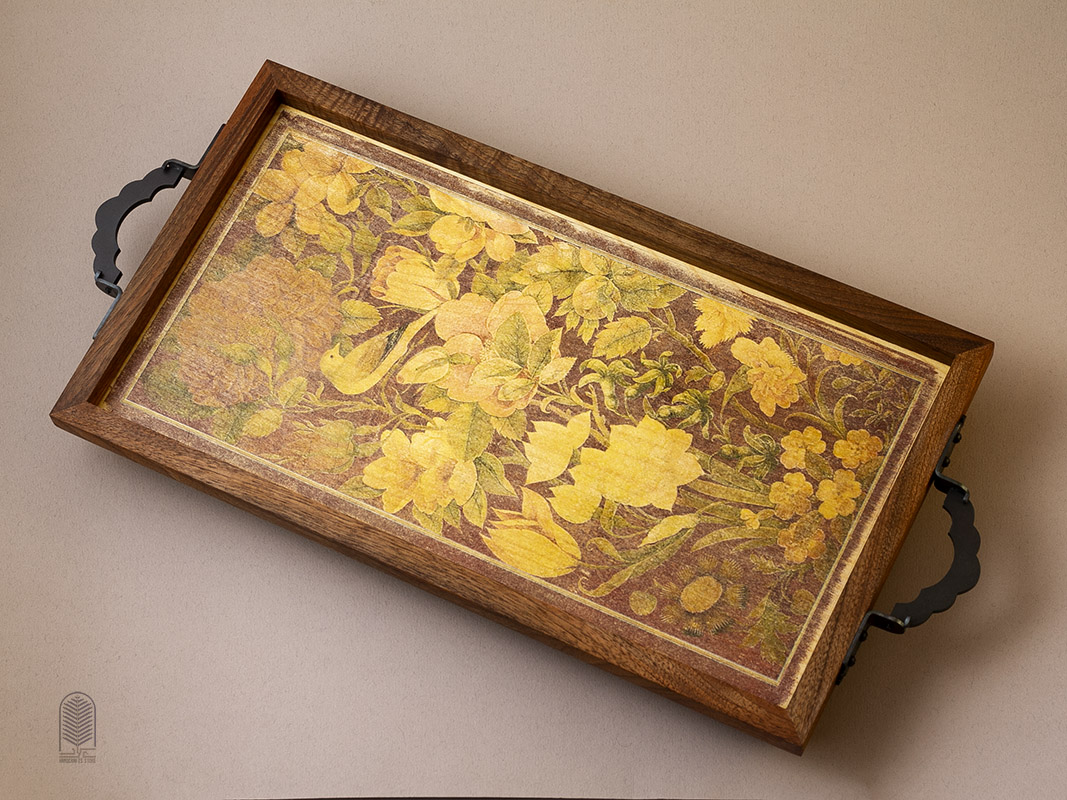این سینی چوبی دستساز با طرح چاپشده روی سطح، ترکیبی از هنر اصیل و کاربری مدرن را به خانهی شما میآورد. بدنهی سینی از چوب طبیعی ساخته شده و با ظرافت بالا پرداخت شده است تا جلوهای گرم و چشمنواز ایجاد کند. سطح سینی با نقش گلهای زرد و طلایی چاپ شده است که الهامگرفته از طرحهای سنتی ایرانی است و حس آرامش و طبیعت را در هر فضا تداعی میکند.
