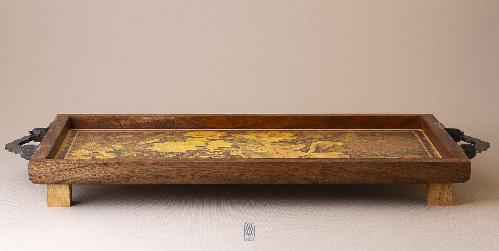 این اثر نهتنها یک ابزار کاربردی برای پذیرایی شیک از مهمانان است، بلکه میتواند بهعنوان یک قطعهی دکوراتیو نیز جلوهای خاص به دکور منزل شما ببخشد. دستههای فلزی مشکی با طراحی کلاسیک، استحکام و زیبایی این سینی را دوچندان کردهاند. سینی چوبی دستساز طرح چاپی، انتخابی ایدهآل برای افرادی است که به جزئیات، کیفیت و زیبایی طبیعی اهمیت میدهند.