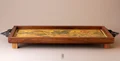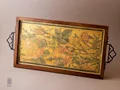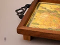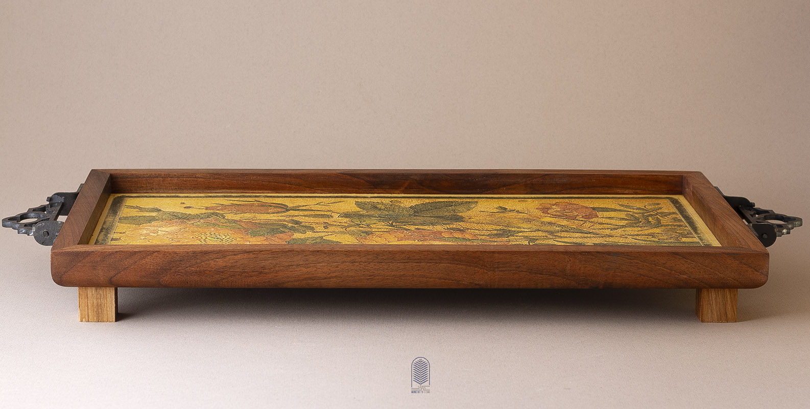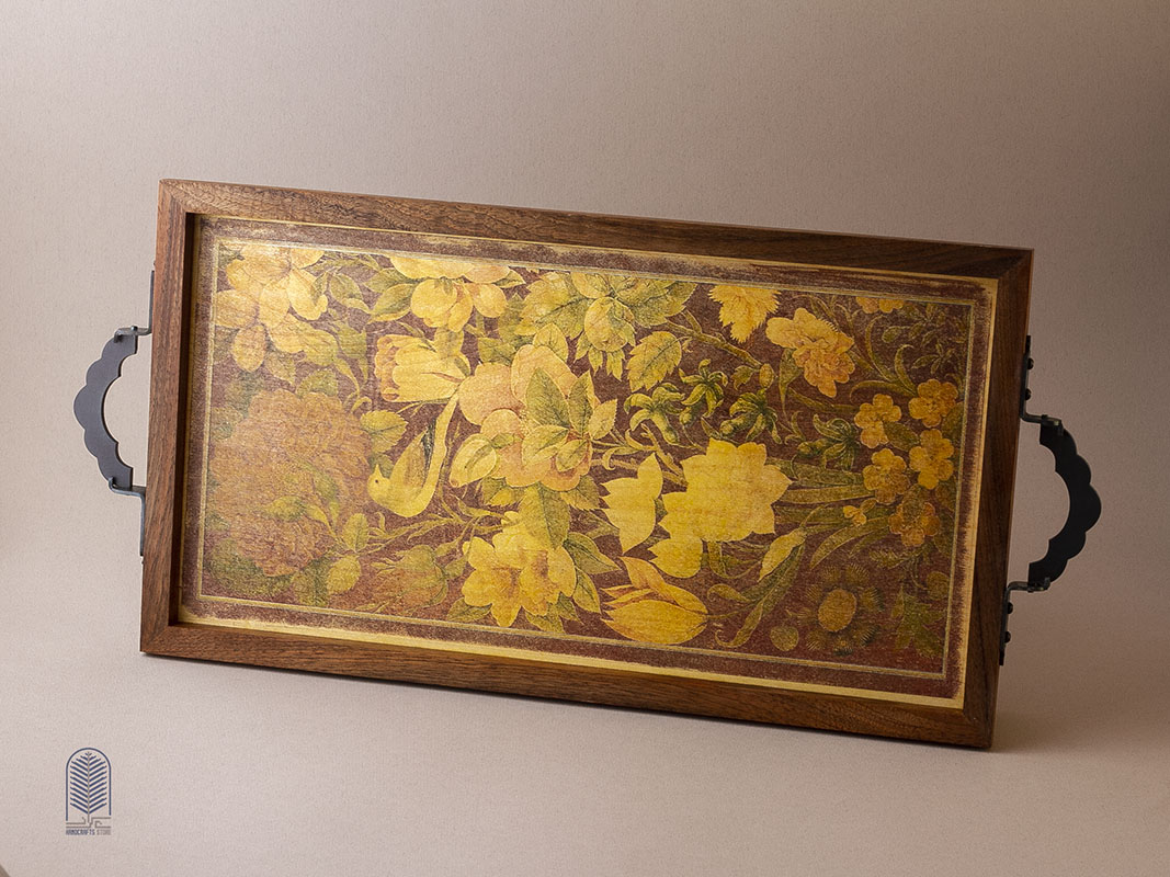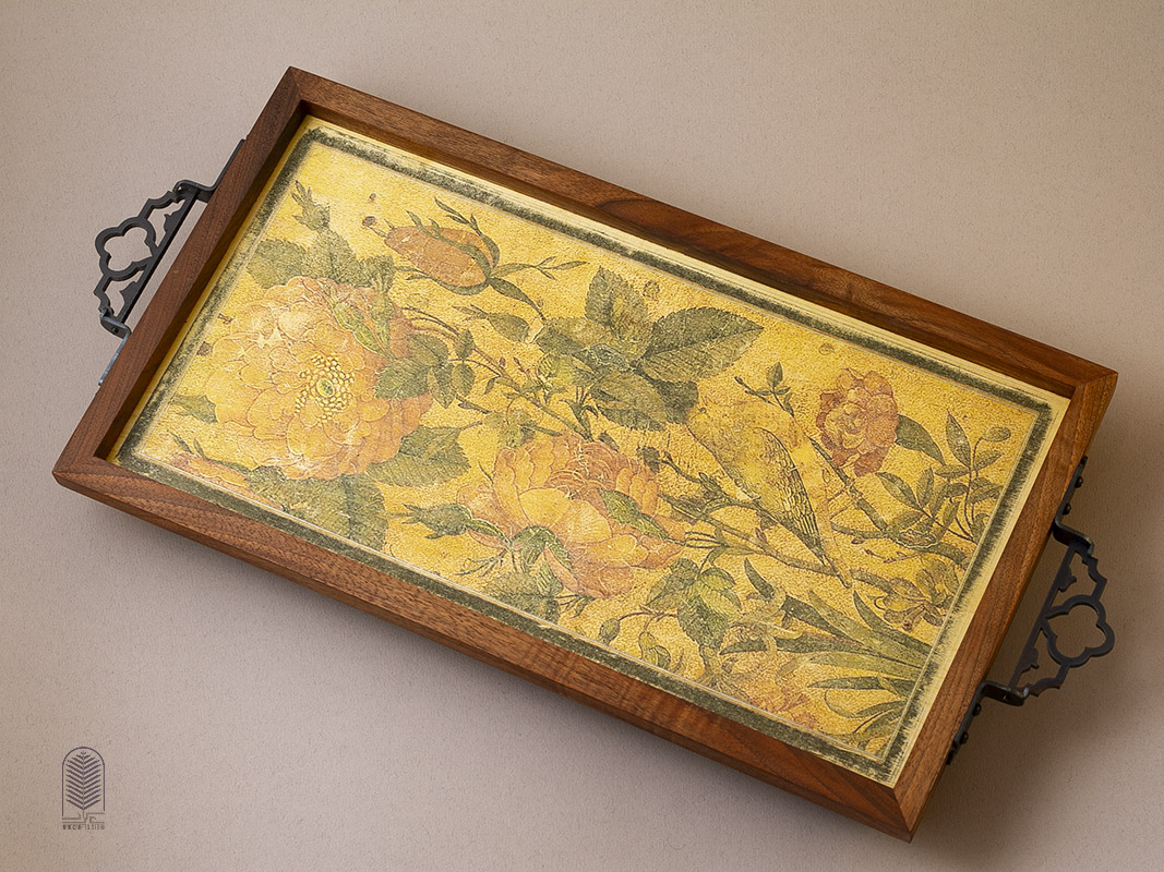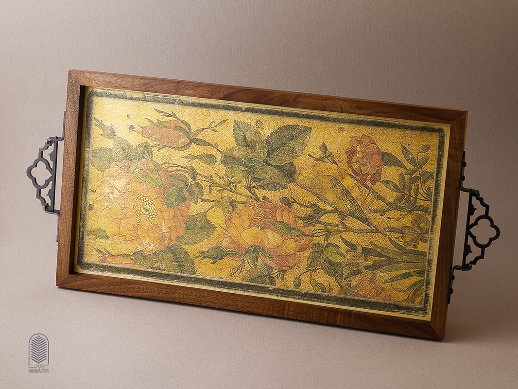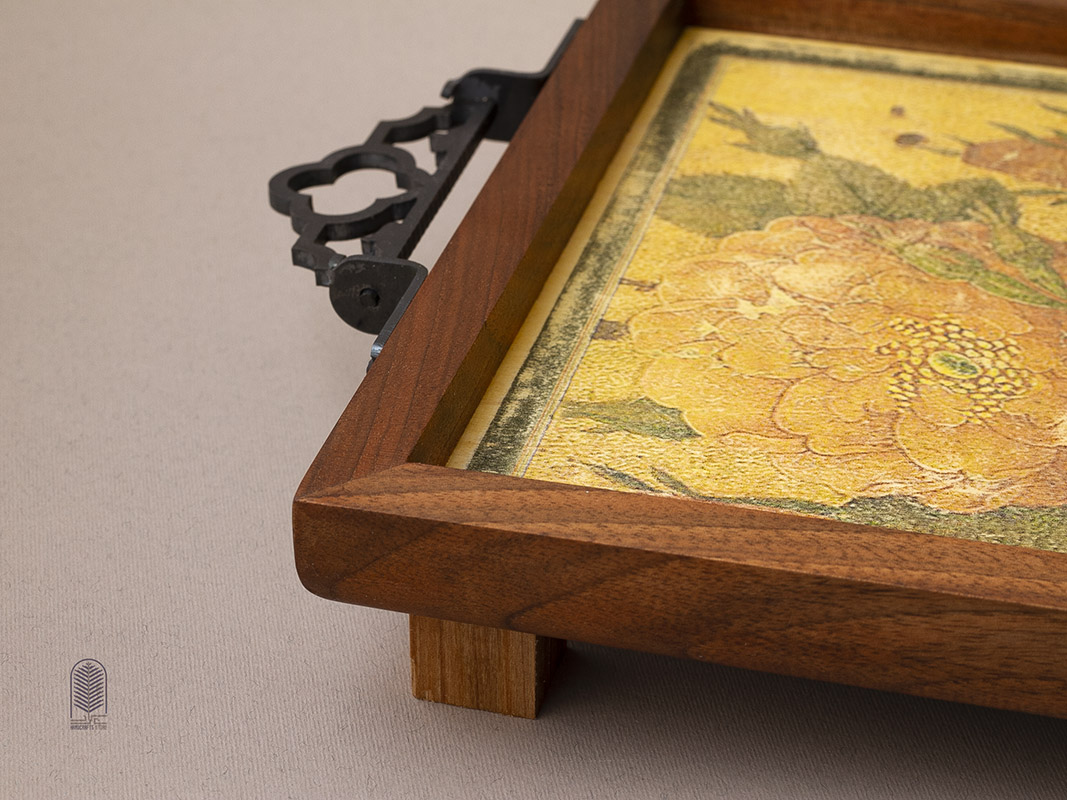 این سینی چوبی دستساز، تلفیقی از هنر سنتی ایران و طراحی مینیمال امروزی است. بدنهی سینی از چوب طبیعی با بافت گرم و اصیل ساخته شده و دستههای فلزی مشکی آن، جلوهای کلاسیک و استوار به اثر میبخشند. در مرکز سینی، چاپ دستی طرح گل و مرغ بر زمینهای زردفام دیده میشود که یادآور نقاشیهای ظریف ایرانی و شور زندگی در طبیعت است. ترکیب رنگهای طلایی، سبز و نارنجی، هارمونی چشمنوازی ایجاد کرده که این اثر را هم برای استفادهی روزمره و هم به عنوان یک المان دکوراتیو متمایز میسازد.
