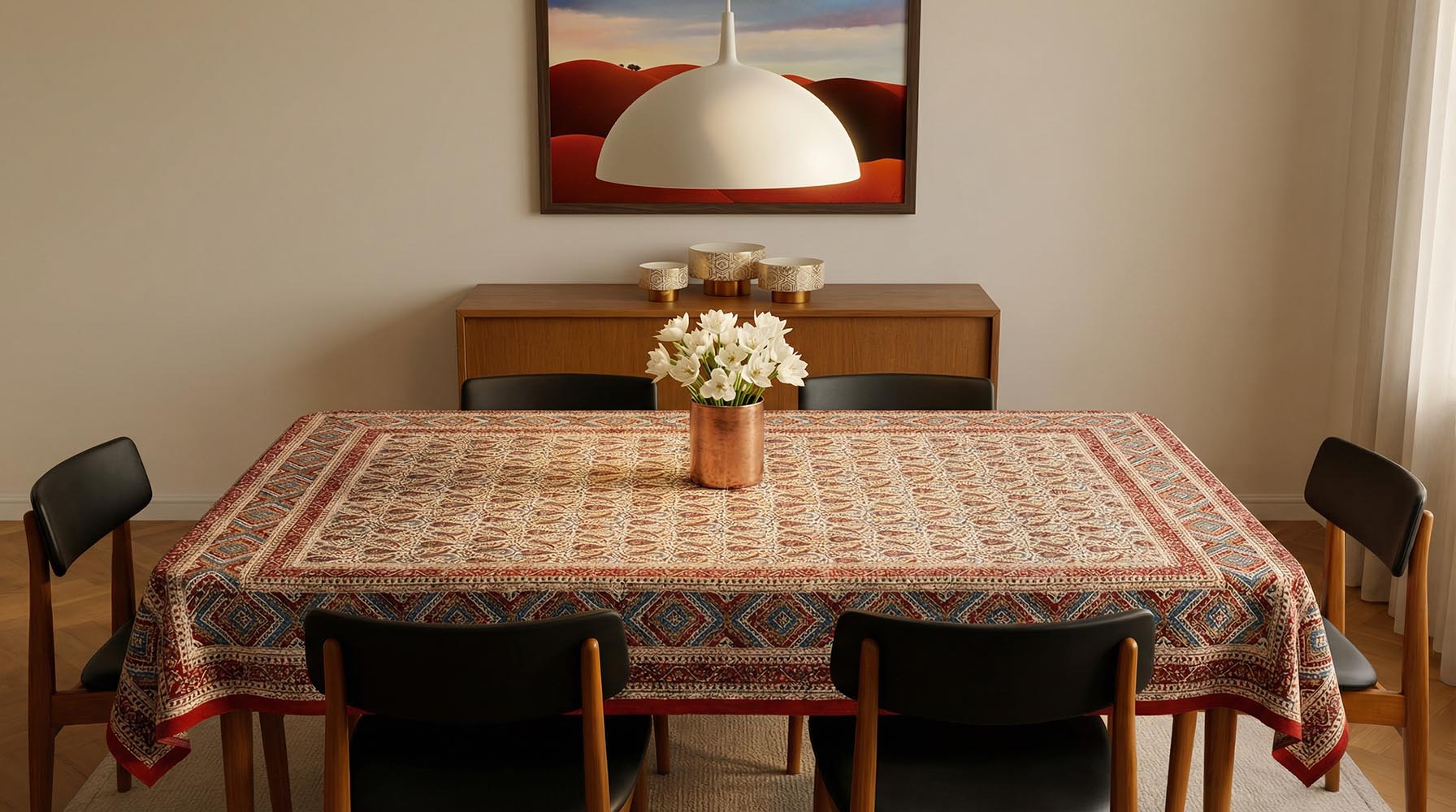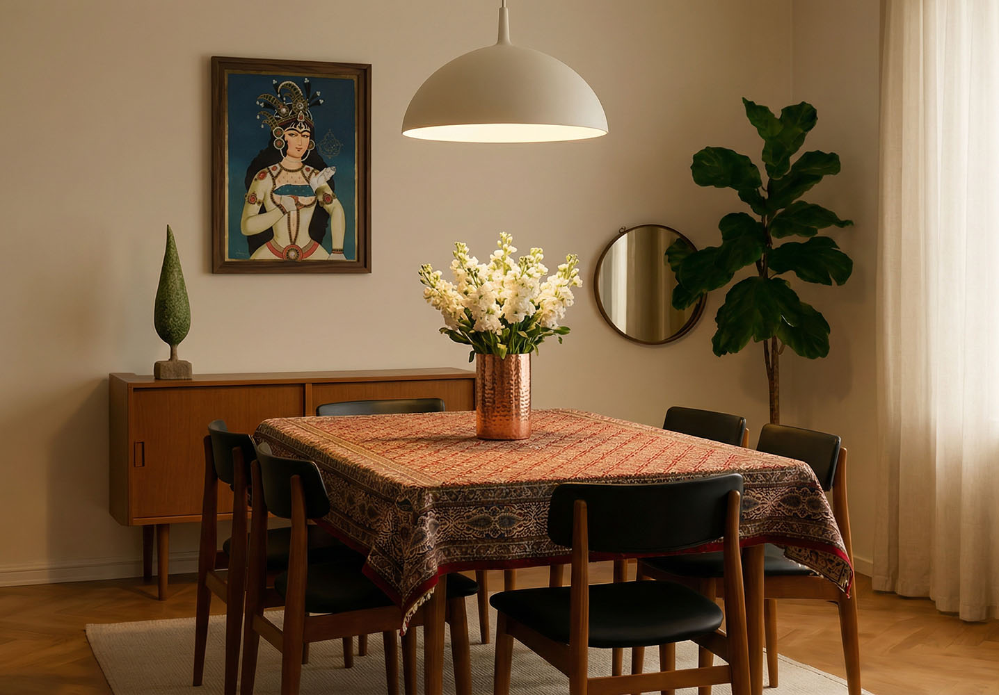 این رومیزی قلمکار با ترکیب رنگهای هماهنگ و طرحهای متقارن، بهراحتی با دکورهای سنتی یا مدرن سازگار میشود. میتوانید آن را روی میز ناهارخوری، میز پذیرایی یا حتی بهعنوان رانر تزئینی استفاده کنید تا فضایی گرم، اصیل و هنری در خانهتان ایجاد کند. حضور چنین اثری، یادآور سادگی و زیبایی هنر دست ایرانی است و لمس آن، حس نزدیکی به فرهنگ و اصالت را زنده میکند.